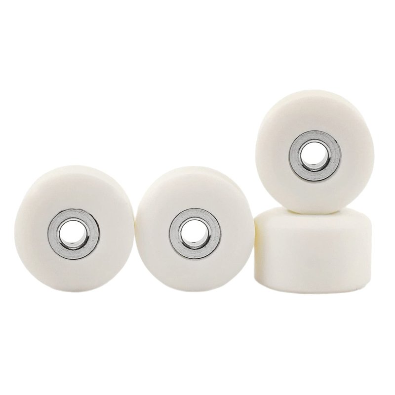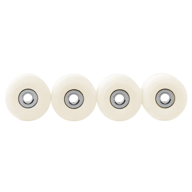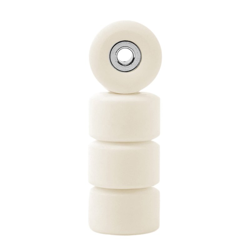 Set of four Apex Series, New Street Style Fingerboard Wheels in "Cream" Colorway. The New Street Style 61D wheels are our softest wheels yet, and are equivalent to 101A hardness. The feel of these wheels are very similar to real skateboard wheels. Measuring 7.7mm in diameter and 4.9mm wide, these wheels are great for easy riding and doing tricks on all kinds of surfaces. These wheels are designed and made in the USA using a premium quality, custom Teak blended urethane. Each wheel is casted and cut in New York. Colors are handmixed and may vary slightly between sets. Many fingerboarders love the squeak sound that urethane wheels make as you powerslide across a surface or do a sharp turn.
