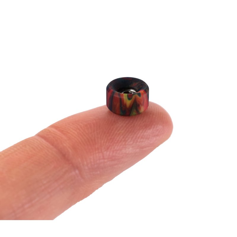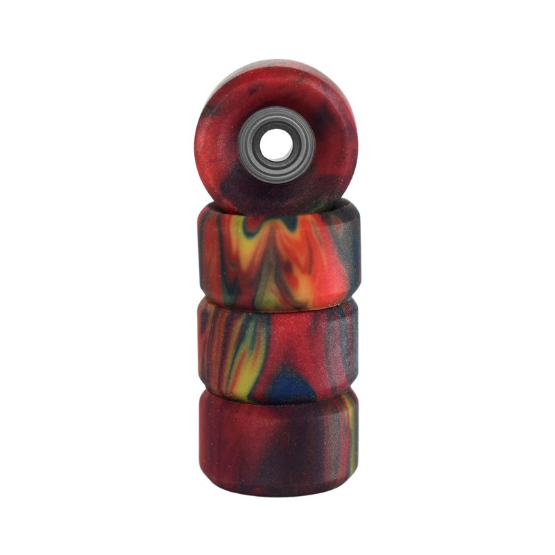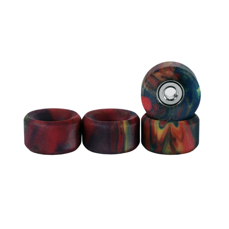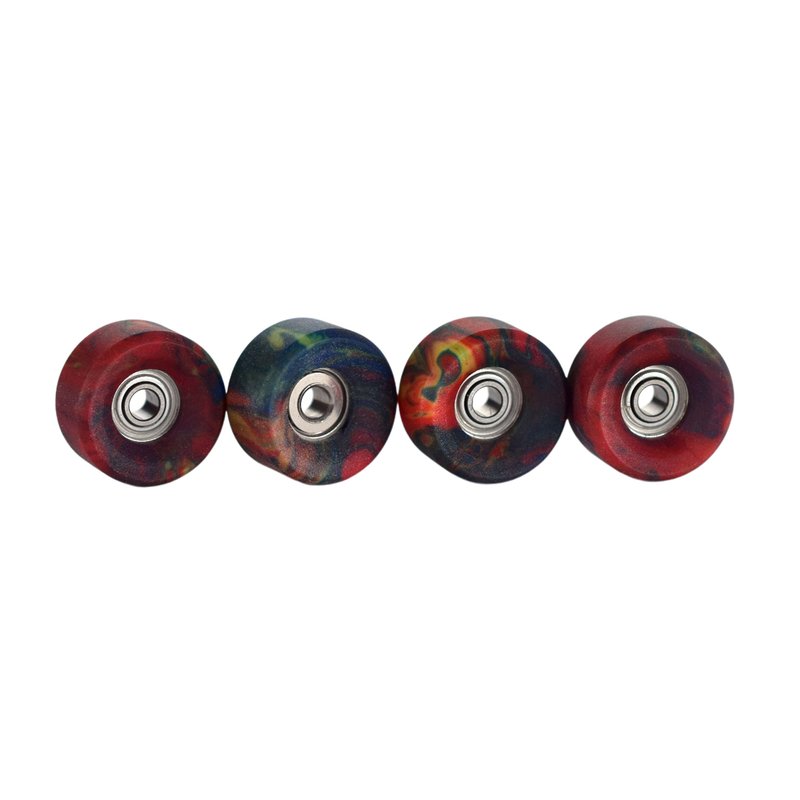 Set of four Apex Series, Slim Bowl Shaped Fingerboard Wheels in "Tie Dye Swirl". Each set of Teak Tuning's Apex Series wheels is designed and made in the USA with premium quality, custom Teak blended urethane. The Slim Bowl shaped wheels hit the sweet spot with a 61D durometer. They’re not too hard, and they’re not too soft. Measuring 7.5mm in diameter and 4.4mm wide, these wheels are a hybrid between the Cruiser style and New Street shape. This shape is a “standard” size fingerboard wheel with similar features to cruiser wheels, making them great for easy riding and doing tricks on all kinds of surfaces. Many fingerboarders love the squeak sound that urethane wheels make as you powerslide across a surface or do a sharp turn. Perfect for riders of all skill levels. Includes a free Teak Tuning sticker.