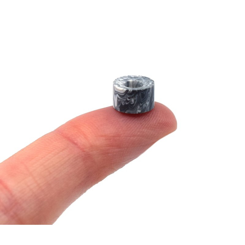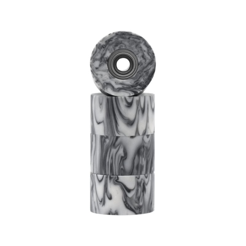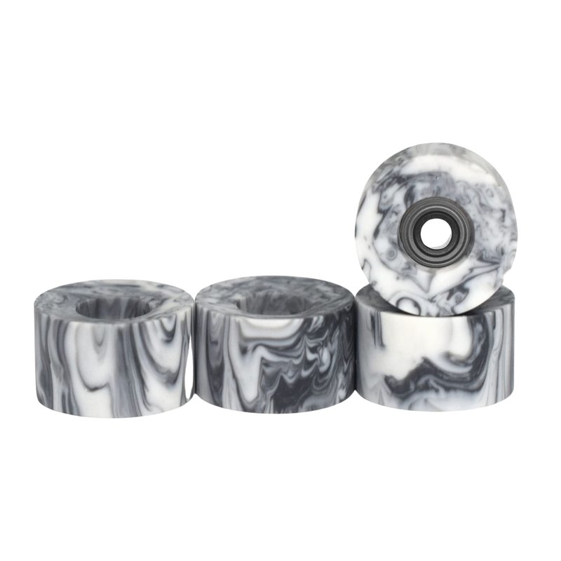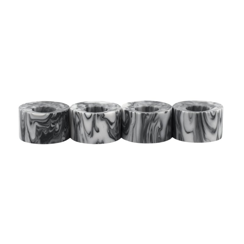 Set of four Apex Series, Bowl Shaped Cruiser Style Fingerboard Wheels in "Grey & White Swirl". Each set of Teak Tuning's Apex Series wheels is designed and made in the USA with a custom, premium urethane. The Cruiser wheels hit the sweet spot with a 71D durometer. They’re not too hard, and they’re not too soft. These wheels contain premium bearings with an ABEC-9 rating. These bearings are our highest quality fingerboard wheel bearings. They are extremely smooth and completely silent. These are sturdy bearings that will allow extreme movement and control. However, due to them being greased and completely shielded, they do not have the free spin our "Ultra Spin" Edition bearings do. In actual use, they are extremely responsive and have a very free roll. Measuring 8.7mm in diameter and 5.25mm wide, these wheels are slightly larger and thicker than standard fingerboard wheels, but are great for easy riding and doing tricks on all kinds of surfaces. Many fingerboarders love the squeak sound that urethane wheels make as you powerslide across a surface or do a sharp turn. Perfect for riders of all skill levels. Includes a free Teak Tuning sticker.