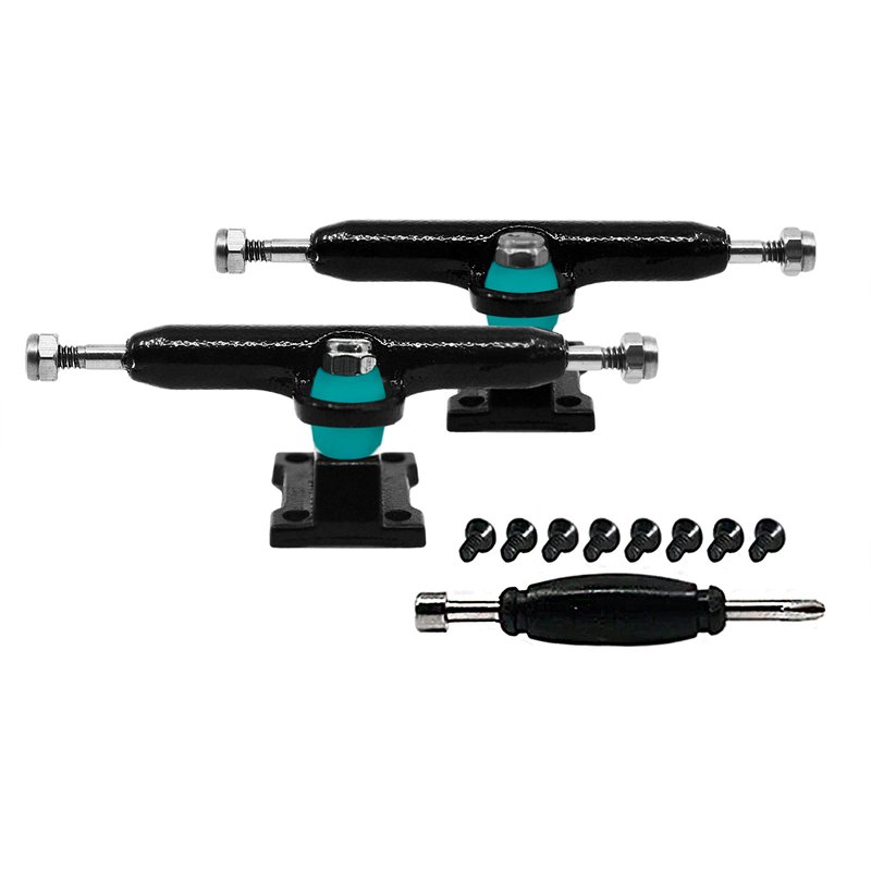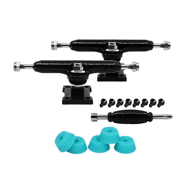 - TUNED & ASSEMBLED || Trucks are both assembled and tuned. Trucks include Pro Duro 61A Bubble Bushings in Teal. All necessary hardware is included - 6 lock nuts with nylon inserts, 8 screws and a standard fingerboard tool