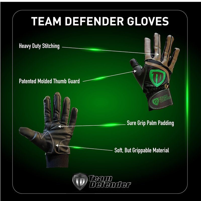 Team Defender Youth Pro Series Protective Catcher's Glove In a single game, the repeated force of impact from catching the baseball can put undue pressure on the thumb portion of the hand and can leave you vulerable to injury in that area. Team Defender's patent pending technology can defend you from hyperextension during every game. The thumb guard is constructed of rigid yet comfortable material that surrounds and supports your thumb - and the guard does not restrict your movement or flexibility. For added performance, every glove is equipped with heavy stitching and light padding in the finger areas. Ensure you investment in you with this smart and reliable glove technology. Thumb guard made of rigid rubber that doesn't restrict movement. Reinforced stitiching allows the user to cut the fingers off if desired. Padded palm and fingers for extra support and comfort. Defender Glove is designed to fit under your fielding glove so selection is based on the hand you throw with.