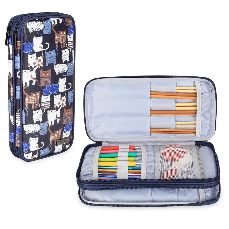 Teamoy Knitting Needles Case(up to 10-Inch), Travel Organizer Storage Bag for Circular and Straight Knitting Needles, Crochet Hooks and Knitting Accessories, Blue Cats-NO ACCESSORIES INCLUDED