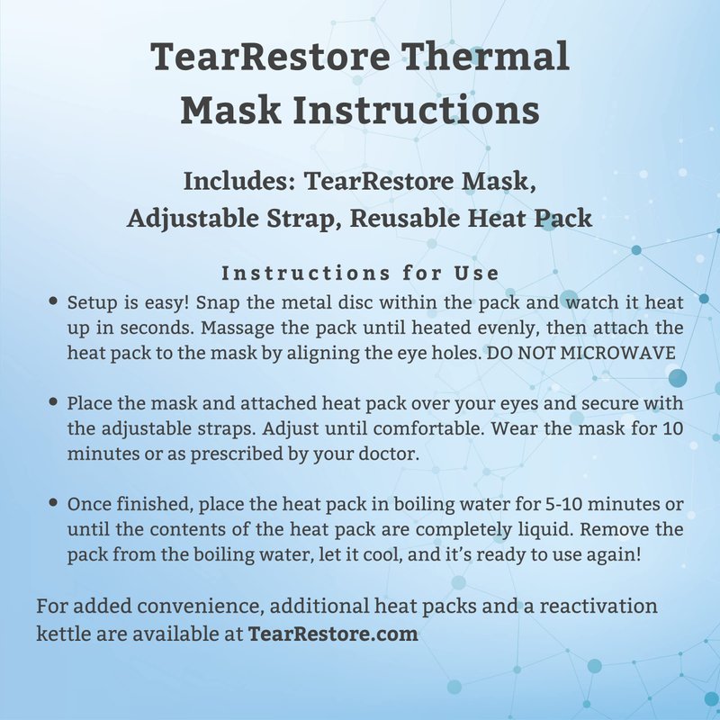 - A Revolution In Warm Compress Eye Mask Technology – The FDA-Cleared TearRestore Thermal Mask is the first and only open-eye warm compress. Developed with top Ophthalmologists to supply the eyelids with therapeutic heat, this is the effective and convenient Dry Eye/Stye treatment you have been searching for.