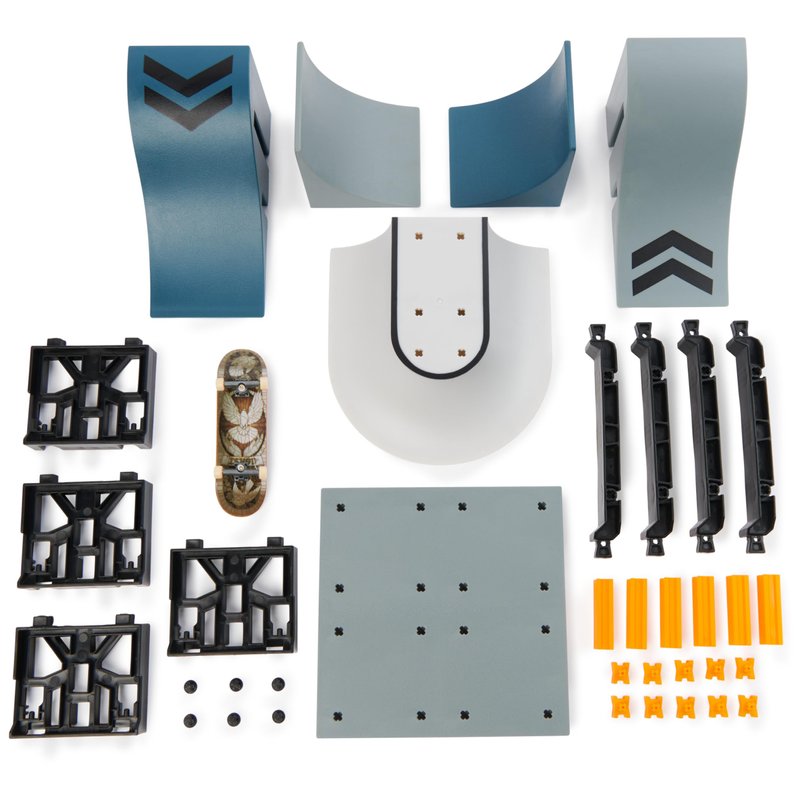 - Includes: 1 Tech Deck Fingerboard, 2 Roll-in Ramps, 2 Large Roll-in Ramps, 1 Wrap-Around Roll-in Ramp, 1 Square Panel, 4 Small Supports, 4 Scaffold Beams, 10 X-Connectors, 6 Large X-Connectors, 6 Foot Pegs, Instruction Sheet