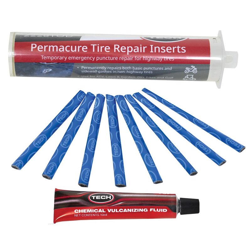 - Kit includes 8 TECH Permacure Repairs and Vulcanizing Fluid in a compact tube. The Ideal Kit if you already own Tire Repair Tools like a Reaming Tool and Insert Tool. Permacure Repairs are Made in the USA.