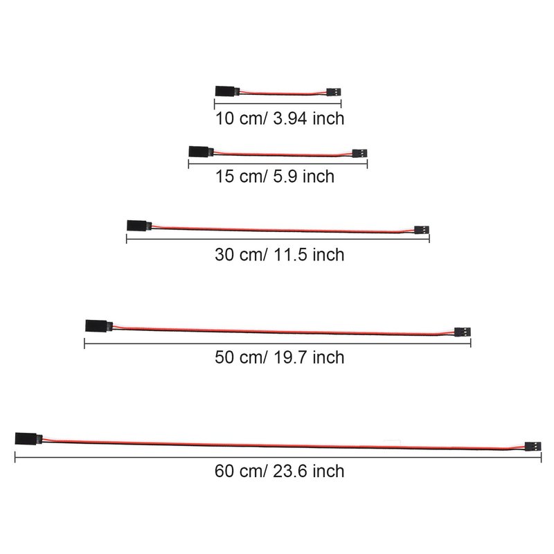 - Servo extension cord sizes: have 6 different lengths of 10 cm/ 3.94 inch, 20 cm/ 7.9 inch, 30 cm/ 11.8 inch, 40 cm/ 15.7 inch, 50 cm/ 19.7 inch and 60 cm/ 23.6 inch, 3.94 and 7.9 inches servo extension cord have 4 pieces respectively, 11.8, 15.7, 19.7 and 23.6 inches servo extension cord have 3 pieces respectively