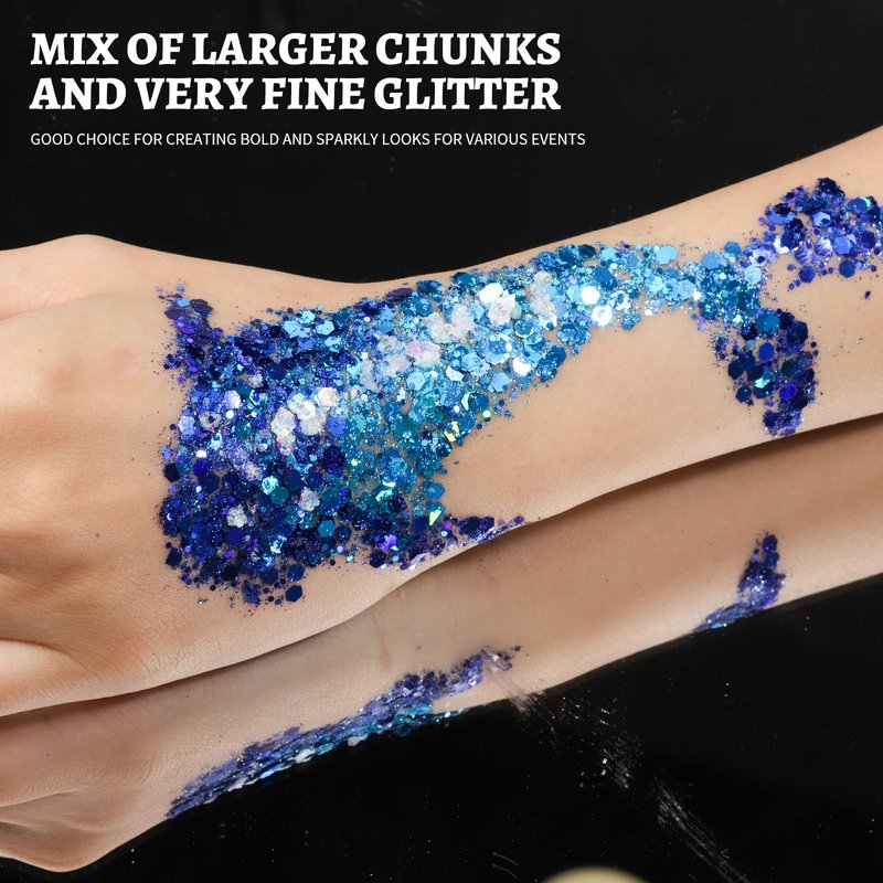 - Versatility in Use: The festival makeup glitters are described as finely textured, stringently pigmented, and light-reflective, making them effective for nail art, face painting, and body decoration. You can use the glitter for a wide range of occasions, from Halloween and festivals to children’s parties and school events