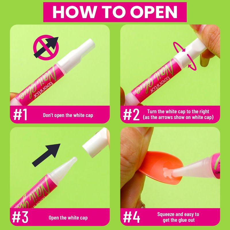 - How to Open: 1. Don’t open the white cap; 2. Turn the white cap to the right(as the arrows show on white cap); 3.Open the white cap; 4.Squeeze and easy to get the glue out.