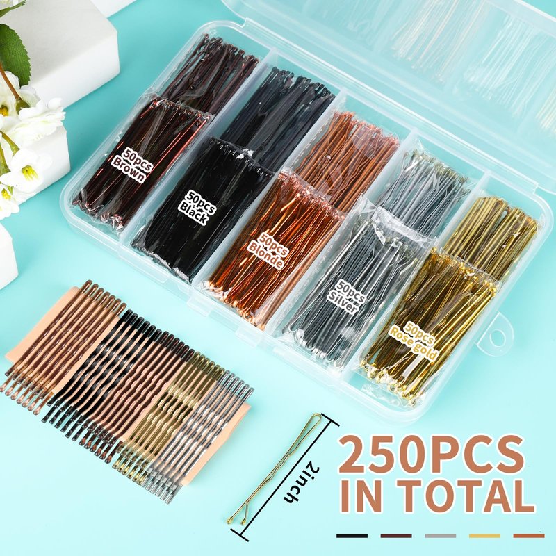 - Bobby pins with storage box: come with 250 count bobby pins in 5 colors(bobby pins brown, bobby pins blonde hair, bobby pins black, silver bobby pin and rose gold), each colors for 50 count hair pins. Bobby pin of 5 colors are placed in classified boxes for easy portability and use