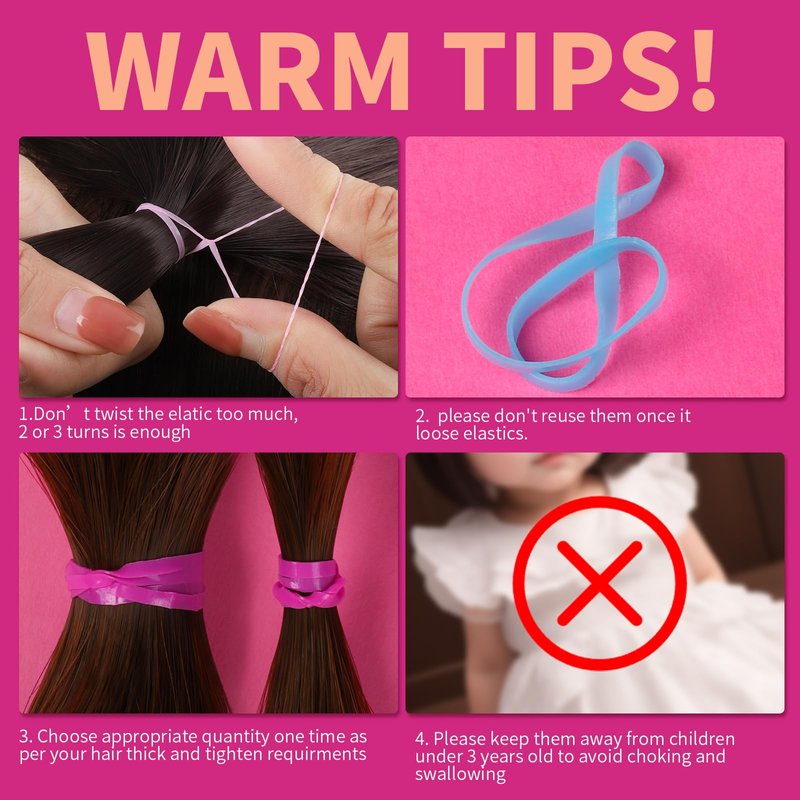 - Warm Tips: These rubber bands are disposable and will loosen after one use, please do not reuse once they lose their elasticity; For thick hair, it is best to use 2 or more rubber bands at the same time to make the hair tight
