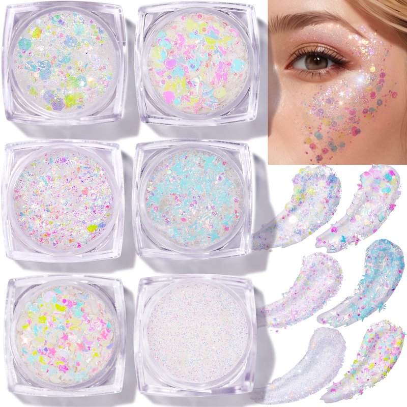 Teenitor Face Glitter Body Glitter, Clear White Body Glitter Gel, Hair Glitter Gel, 6 Shapes Rave Glitter, Mermaid Sequins Makeup Glitters Face Paint, Chunky Sparkling Glitter Gel for Women