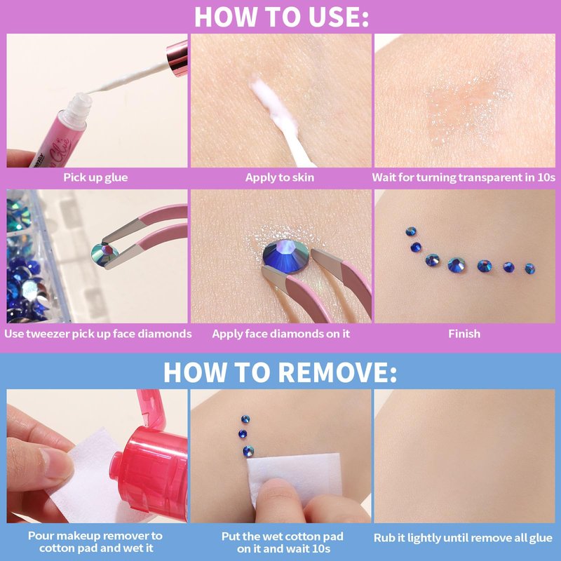 - Teenitor Multifunctional Makeup Glue for Face: Made of premium quality body glue, waterproof, no pungent smell and does not irritate skin. Glue is white, quickly turn clear in 10s - just apply a thin layer is ok, super strong adhesive will make your face gems and body glitter stays well for a long time and not easy to fall off(compare with Self Adhesive face gems, this glue allow stay at least one day even sweat profusely at concert).Easy to remove by warm water, alcohol or makeup remover