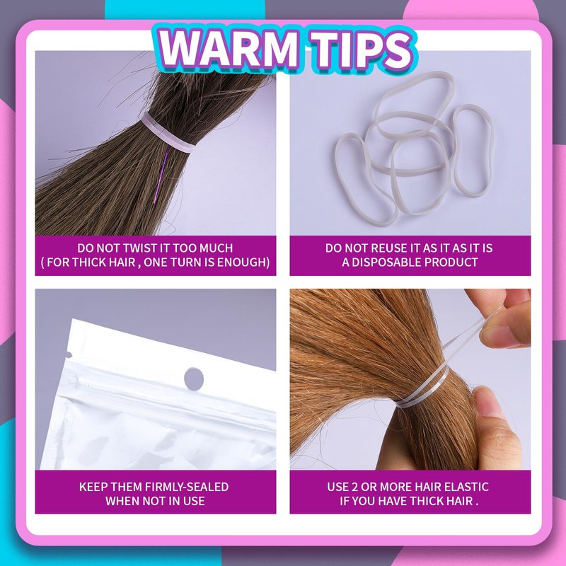 - Warm tips: the Grey rubber bands are disposable, if reused, they will become a little bigger each time, please do not reuse once the elastic band is loosened. You can choose the appropriate number at a time according to the thickness and tightness requirements of your hair.