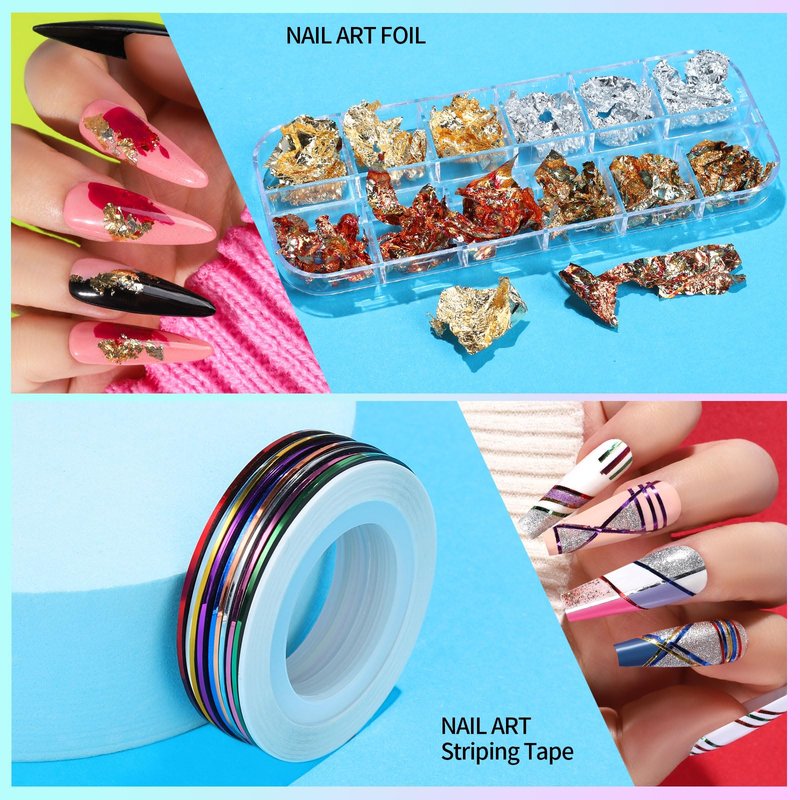 - Nail Art Foils & Nail Art Striping Tapes: 1 box nail foil in gold and silver color that is used for decorating your nails, making them shiny in any way you want. Nail art striping tape in a variety of colors to suit every client and meet all of your nail art design ideas. Easy to creates perfect straight line designs on nails.