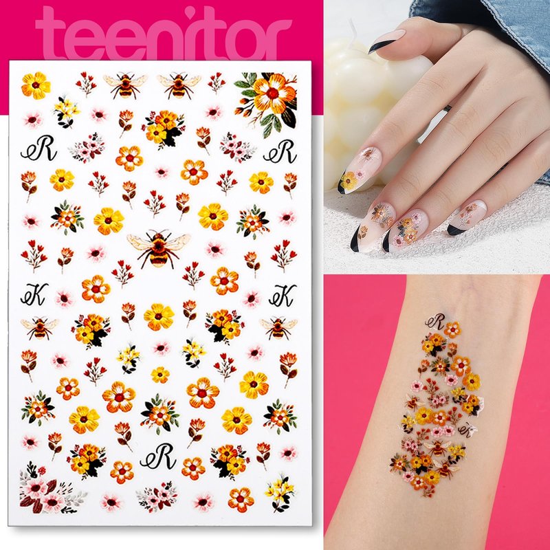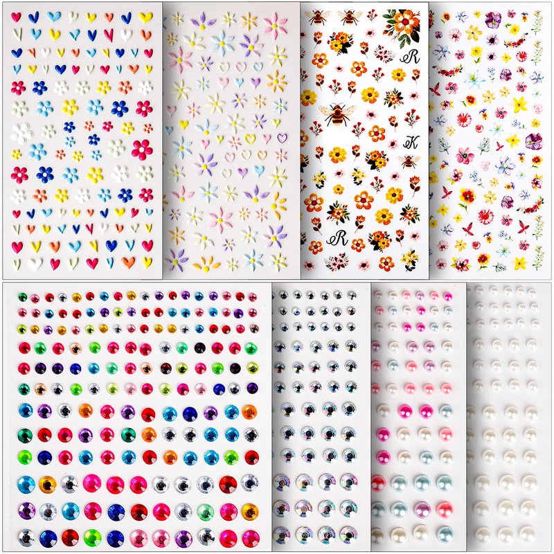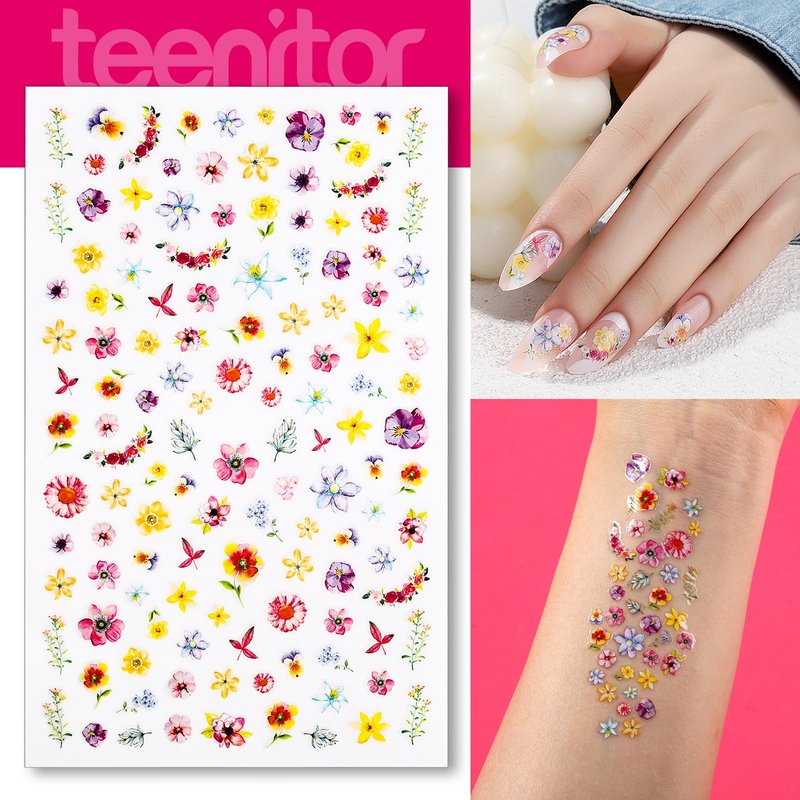 - VERSATILE DESIGNS NAIL STICKERS - 2 sheets 5D nail stickers + 2 sheets 3D nail art stickers + 1 sheet ab rhinestones stickers + 1 sheet multi-color rhinestones stickers + 1 sheets white pearls stickers + 1 sheet multi- color pearls stickers. Teenitor easy to use and move self adhesive nail stickers kit come in a variety of designs to match your unique style. From glittery to floral, we have something for every taste.