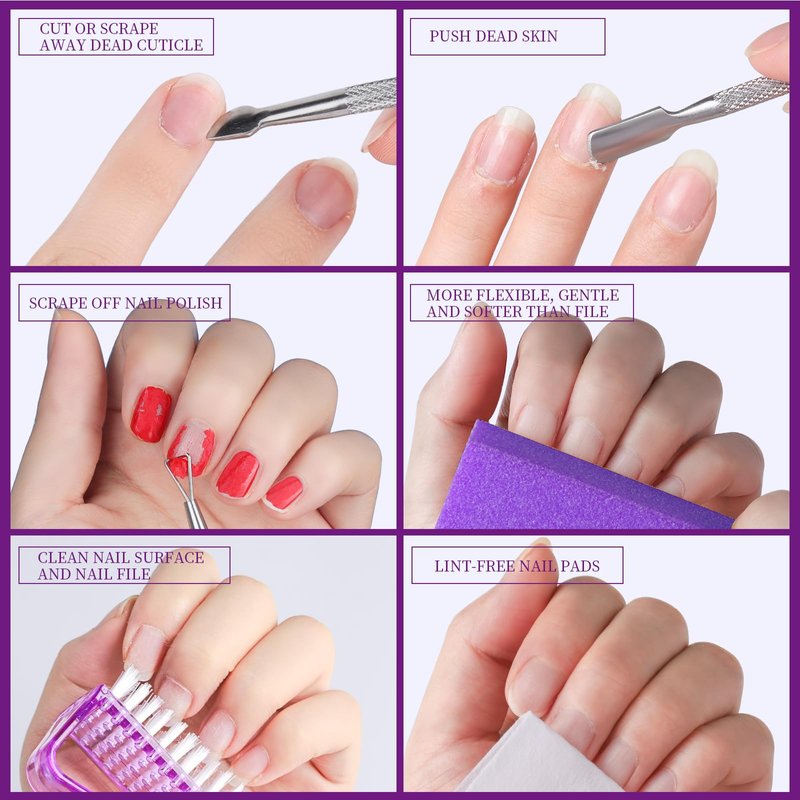 - Meet your needs cuticle remover: cuticle remover kit comes with 1* 10ml cuticle remover + 2*100/180 black grit nail files + 2*100/180 gray grit nail files + 1*400/4000 nail file + 1* purple nail buffer block + 1* 10ml lavender cuticle oil +1*cuticle peeler scraper + 1*cuticle pusher + 1* purple brush + 50 pcs nail remover pads. Perfect manicure kit for beginners
