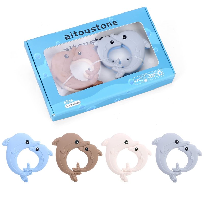 - Dolphin Teether Design Safe, Aitoustone Provide The Original Dolphin With Normal Dot Before. However, After We Testing, The Dot Is Possiable Fall Off When Baby Bite It, We Give Up The Originla Design And Change to Donut Dot. The Safe Is Most Important of Aitoustone