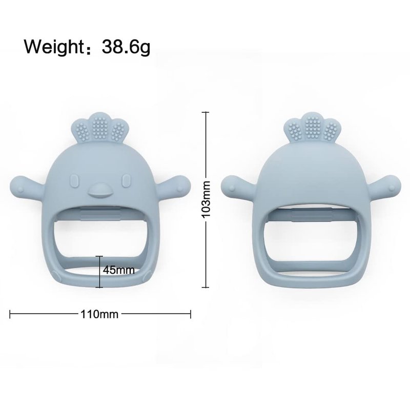 Introducing our reliable Baby Teething Toy Set, carefully crafted to provide comfort and relief during your little one's teething journey. Made of BPA-free, food-grade silicone, it meets the highest safety standards, ensuring your baby's well-being. The teething mitten is perfect for 0-6 months, acting as a soothing pacifier, while ages 3-6 months will find relief using it as a teething toy. Designed with utmost safety in mind, the teething mitten stays securely on your baby's wrist, preventing drops and ensuring safety. Its non-choking design keeps the breast-shaped part from flipping over, eliminating the risk of suffocation. Say goodbye to odd smells and potential choking hazards, as our teether is 100% safe and free from harmful chemicals. Gentle on delicate gums, the soft silicone teether mimics the feel of breastfeeding, providing comfort and relief during teething. The nipple part is thicker and chewy, allowing babies to alleviate teething pain through gentle nubbing and pulling. Encourage healthy sensory development as your baby explores the world through mouthing. Our adorable chicken buddy teether stimulates senses, introducing them to different textures, tastes, and temperatures. Watch as your baby builds essential motor skills they'll use later in life. Cleaning is a breeze with our dishwasher and freezer-safe teething toy. The compact size allows for easy storage and fits snugly in a diaper bag for on-the-go parents. It's also an excellent addition to high chairs and car seats, keeping babies amused and occupied while adults handle their tasks. Give your precious one the gift of love and relief with this teething toy. Not only does it protect their gums, but it also enhances their grasping ability. Say goodbye to finger-biting and satisfy teething needs safely. With our teething toy set, you can be confident that your little one's teething journey will be met with comfort, safety, and joy.