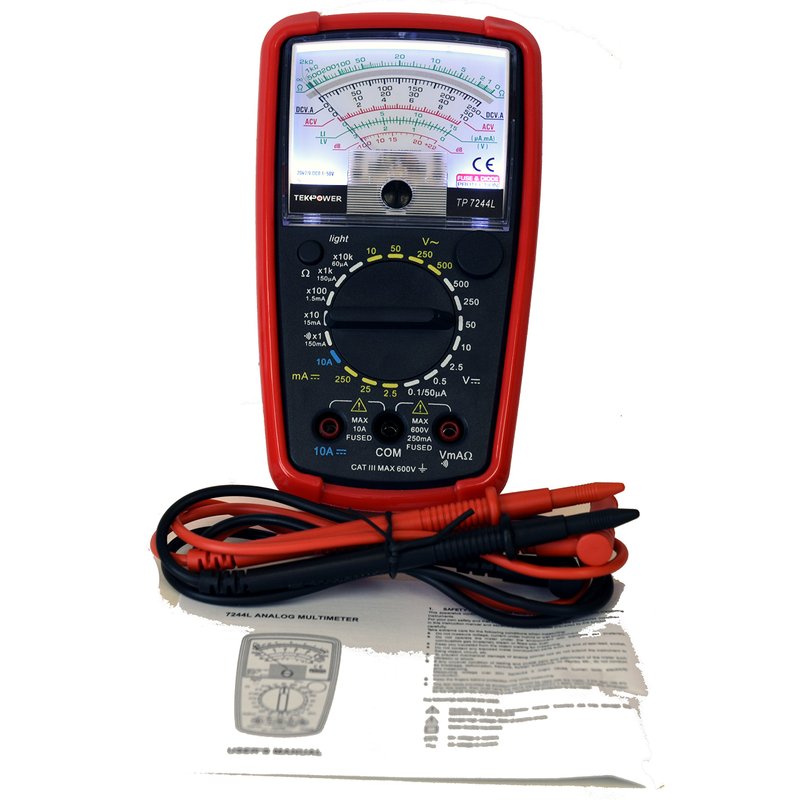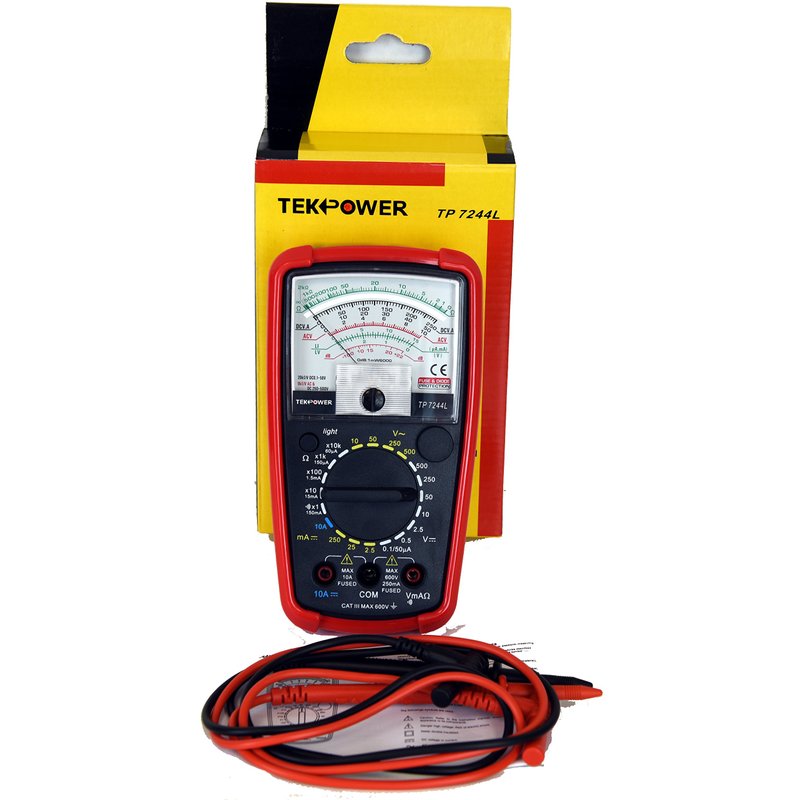 The Tekpower 7244L is a 20-Range Analog Multimeter, which you can use to measure AC/DC voltage, DC current, resistance, continuity, decibel values/dB and diode test.