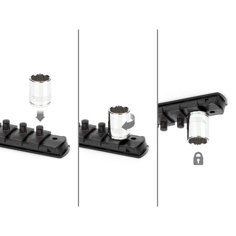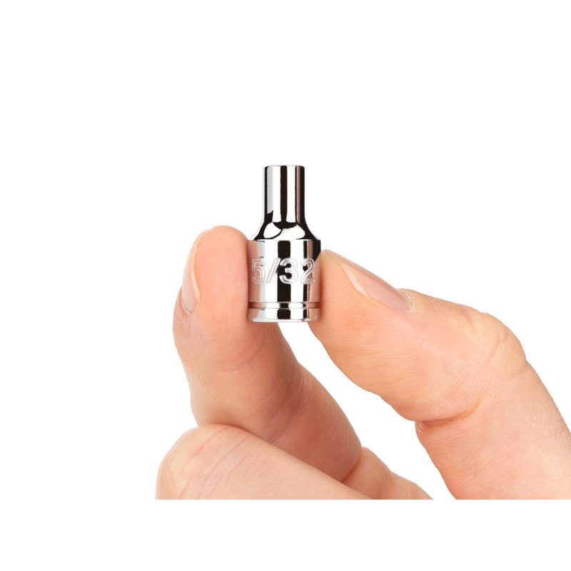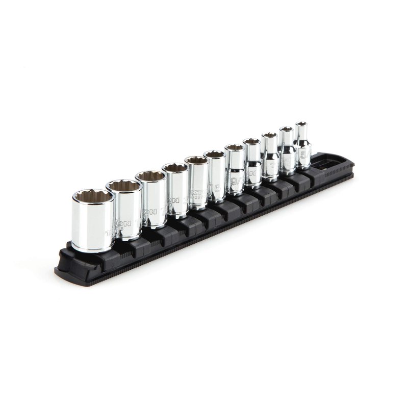 - Includes 11-pc. 1/4 in. drive 12-point sockets: 5/32, 3/16, 7/32, 1/4, 9/32, 5/16, 11/32, 3/8, 7/16, 1/2, 9/16 in.; Socket rail