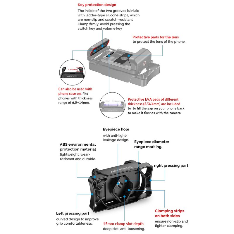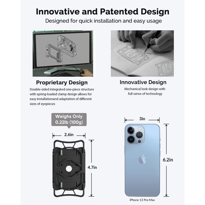 - Stable & durable: Microscope iphone adapter, composed of durable nylon + fiber polymer frame and metal parts. "Mortise and tenon" one-piece structure, multiple anti-loosening design, 15mm eyepiece slot depth and non-slip thread, locking the eyepiece is not easy to fall off, more stable.