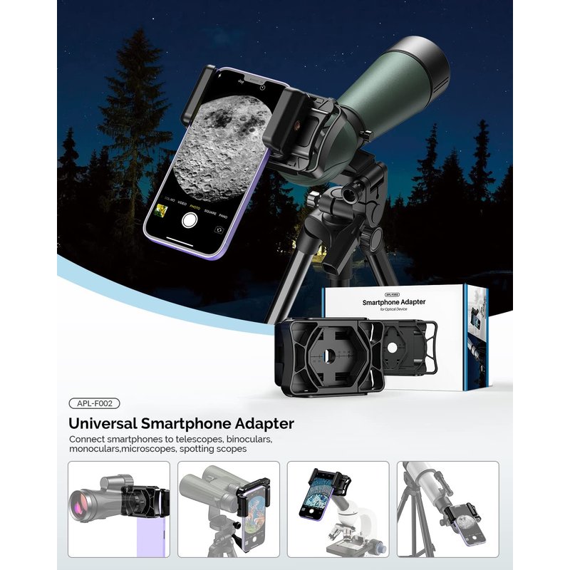 - Universal Compatibility: This spotting scope phone adapter for optical devices, including astronomical telescopes, monoculars, binoculars, microscopes, and spotting scopes. practically all cellphones now on the market, including iPhone, Samsung, Google, Huawei, etc., are compatible.