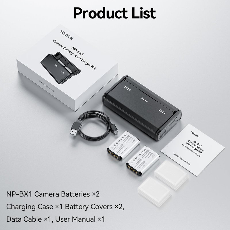 - đ·ăSide Charging Port, User-friendly DesignăUnlike the other NP-BX1 battery charging case in the market put their charging port at the bottom, TELESIN NP-BX1 quick charger storage case built with side charging port for your charge work, which makes it possible store the charger with cable in pocket together, much more convenient for carrying.
