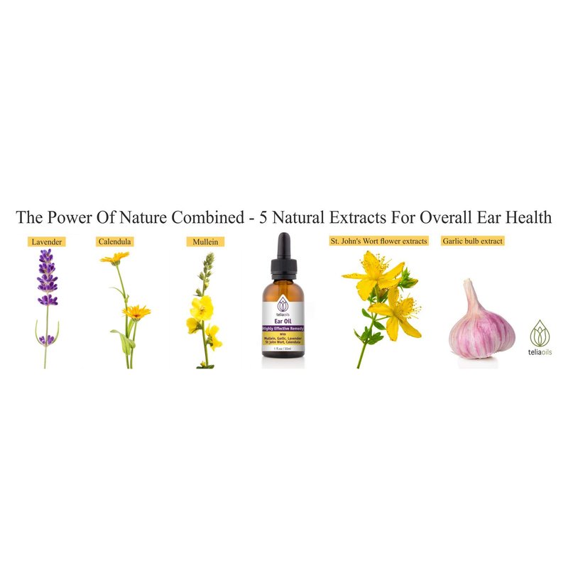 - CERTIFIED ORGANIC FORMULA FOR EXTREME POTENCY: Teliaoils ear drop proprietary blend includes natural Mullein, Garlic, Calendula, Lavender and St. John’s Wort flower extracts, all extracted into certified organic and cold-pressed Olive oil for maximum potency and purity. To ensure a broad spectrum of plant compounds, each herb is individually extracted, while its formula is also Non-GMO, Gluten & Alcohol free.