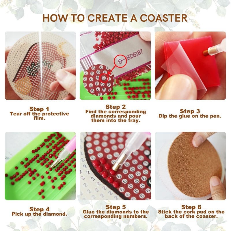 - Easy To Operate:This diamond coasters kit comes with diamond painting tools that allows you to complete six coasters. First tear off the protective film on the coaster, then find the rhinestone you need according to the number/letter on the coaster (the corresponding number/letter is marked on the bag) to start making. Lastly, stick the cork pad on the back of the coaster.