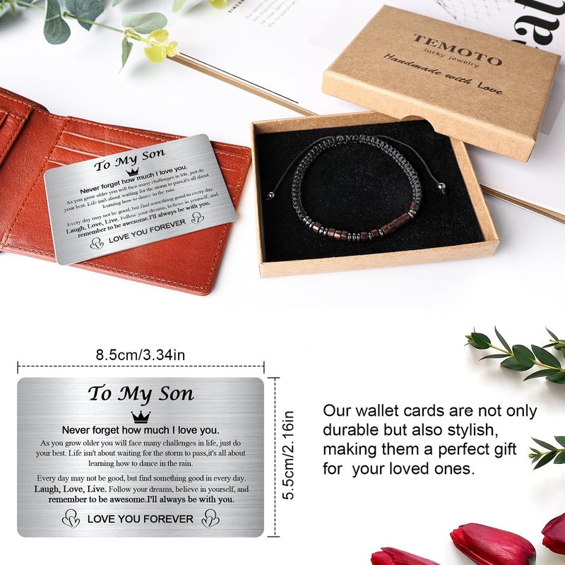 - Our unique cuff bracelet comes with an engraved wallet card that fits easily into most wallets or credit card holders. Your son can carry your heartfelt message with them wherever they go, reminding them of your love and support.