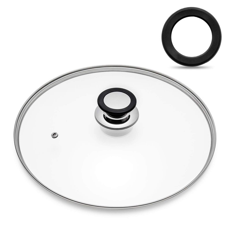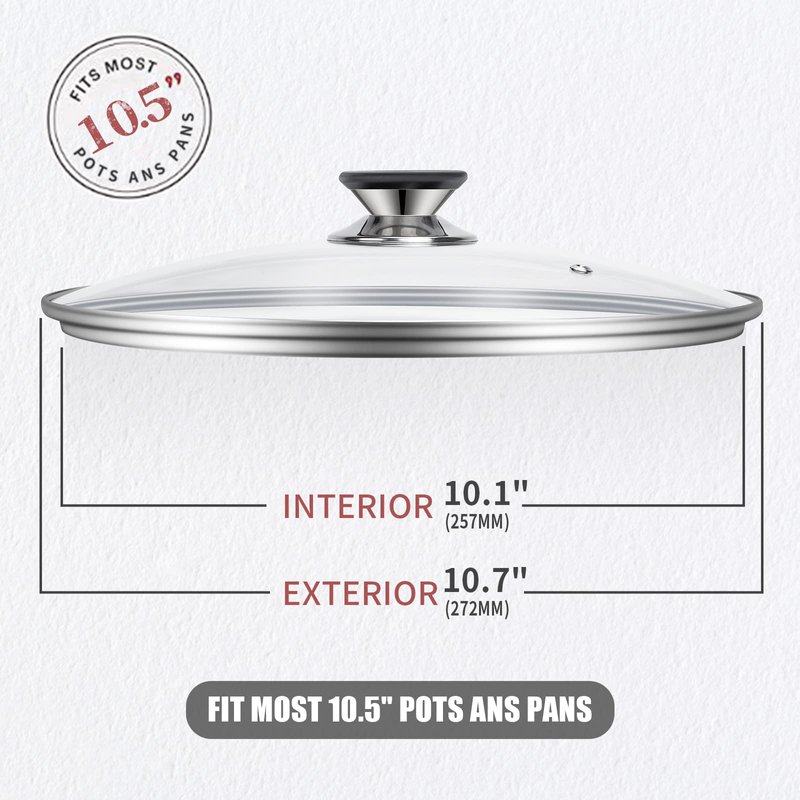 - CLEAR GLASS LID:10.5-inch glass replacement lid for pots and pans seals in heat and flavor while you watch foods cook.Please ensure Pan inner rim measurement is 10.1-10.7 inches for fit.