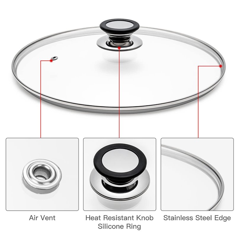 - VENTED TEMPERED GLASS LID: Transparent glass for clear viewing, perfect for slow cooking and sautéing.