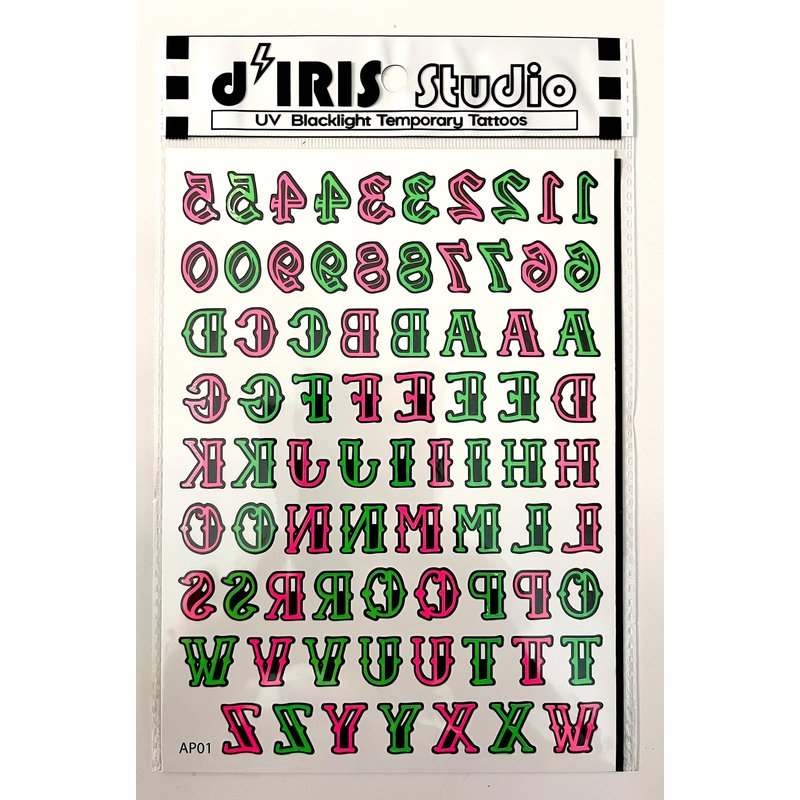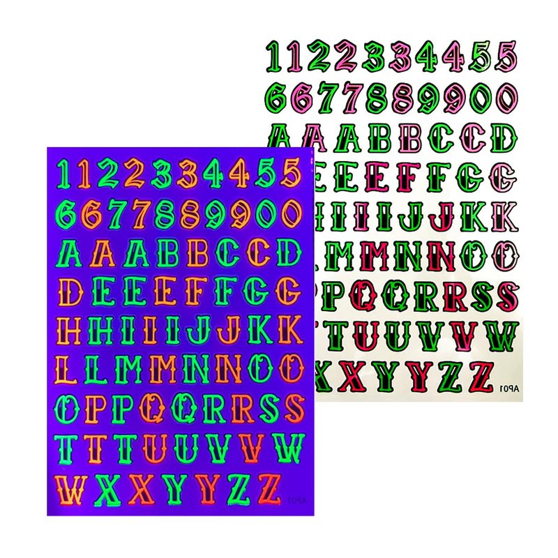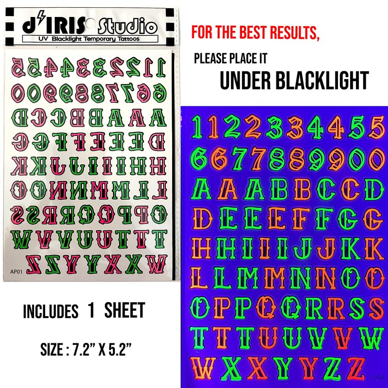 Temporary Blacklight Reactive Tattoos – 1 Sheet Neon Letter Alphabet Numbers Rave Accessories Glow in the Dark Party Supplies | Knuckle Temp EDM EDC Party