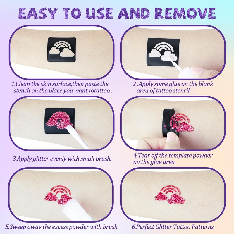 - 🍭【Cautions】 The effect lasts 3-7 days. Sensitive skin and children under 3 years of age need to do a test before use.【instructions for use】1.Stick the template on the part to be tattooed 2.Apply a small amount of glue and wait for the glue to become transparent 3.Apply glitter evenly with a small brush 4.Remove the template and use a large brush to sweep off the excess glitter. Easy to clean and will not damage your skin. Temporary tattoos can be removed with soap and water or makeup remover.