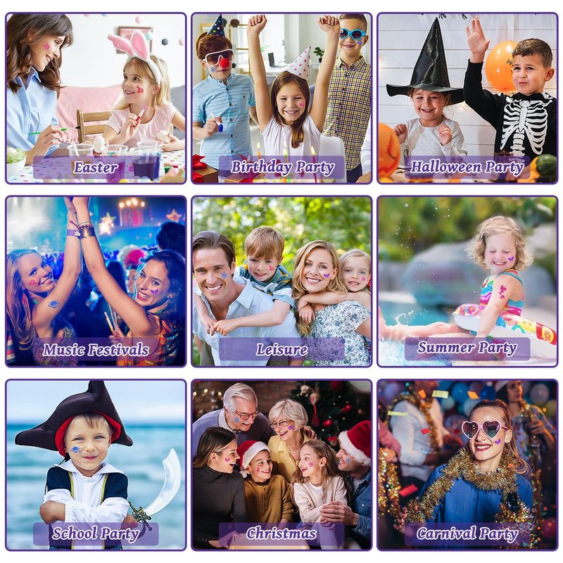 Suitable for children, adults. Enjoy the fun and art of fashion glitter tattoos. Unique glitter tattoo temporary tattoos, the effect lasts 3-7 days, can be applied to birthday parties, summer parties, Hawaiian parties, carnivals, rave parties, stage performances, children's day, Halloween, Christmas, cosplay and so on.