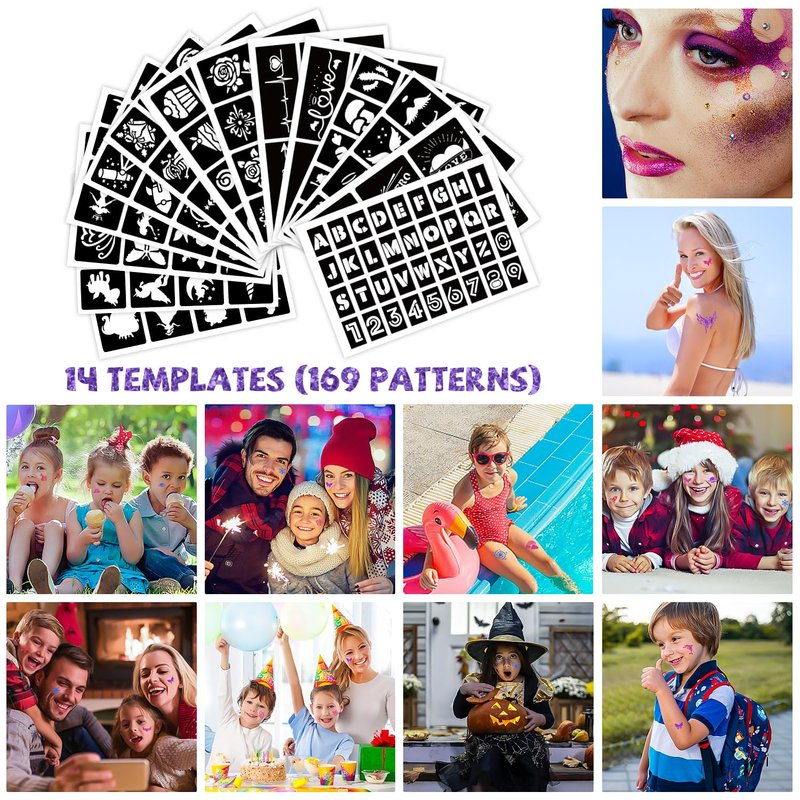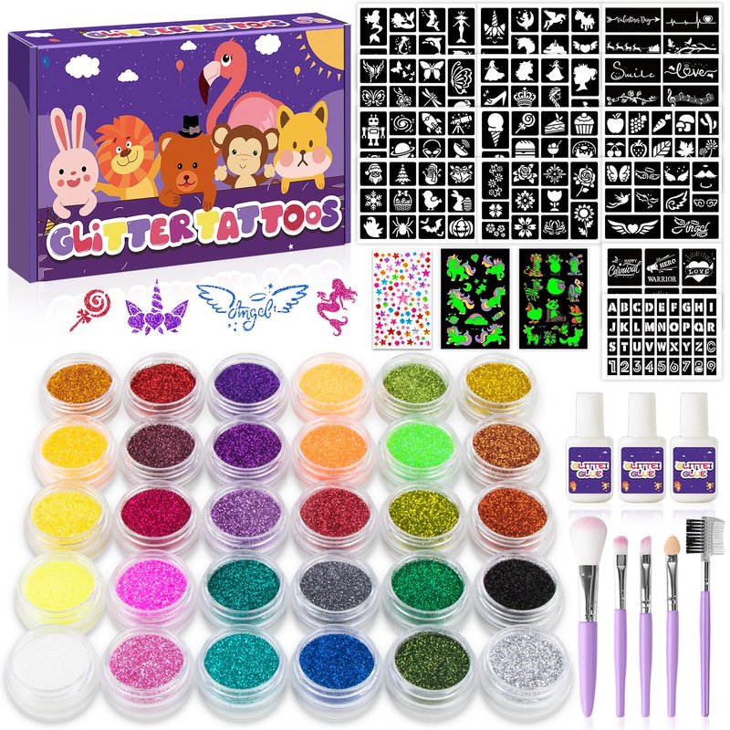 - 💖【Tattoo Glitter Set】30 colors tattoo glitter, 2 tattoo stickers and 1 diamond stickers,14 tattoo stencils (169 patterns), 5 makeup brushes, 3 bottles of glue,1 beautiful box. This tattoo glitter kit contains everything you need to make your entire party unique and sparkling. Have fun with your friends at the party.