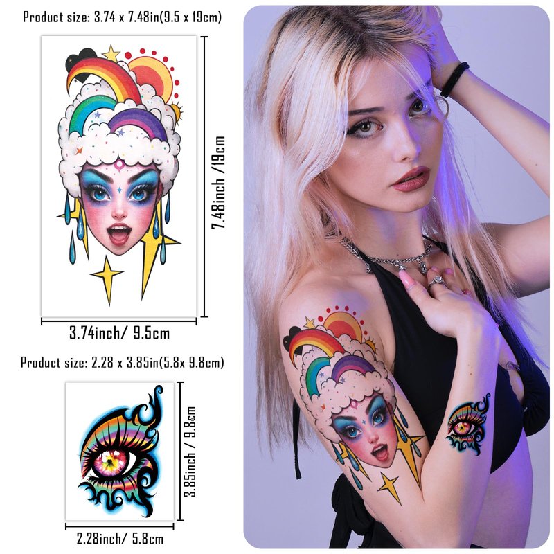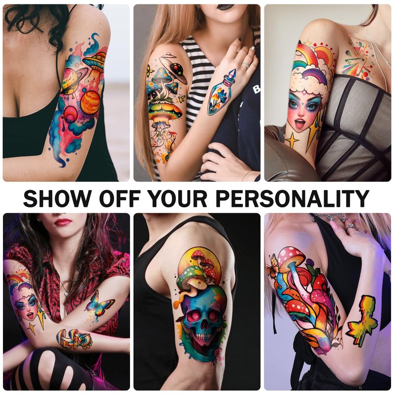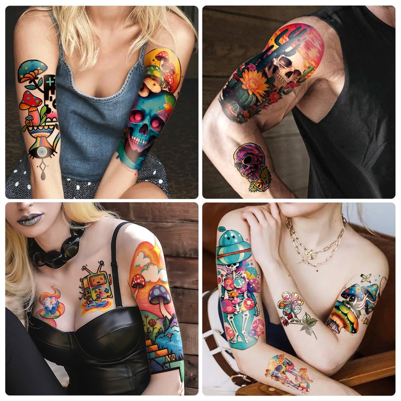 - 🍄【Hippie Half Arm Fake Tattoo】Immerse yourself in a world with this vibrant, new tattoo design. The enchanting mushroom motif, infused with an explosion of vibrant colors, brings deifference to your skin. It's a unique piece for those who dare to be different, enjoying a slice of beauty in their life.