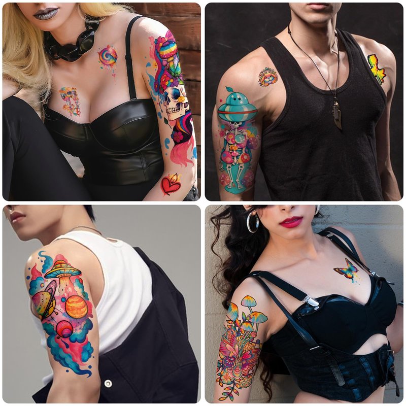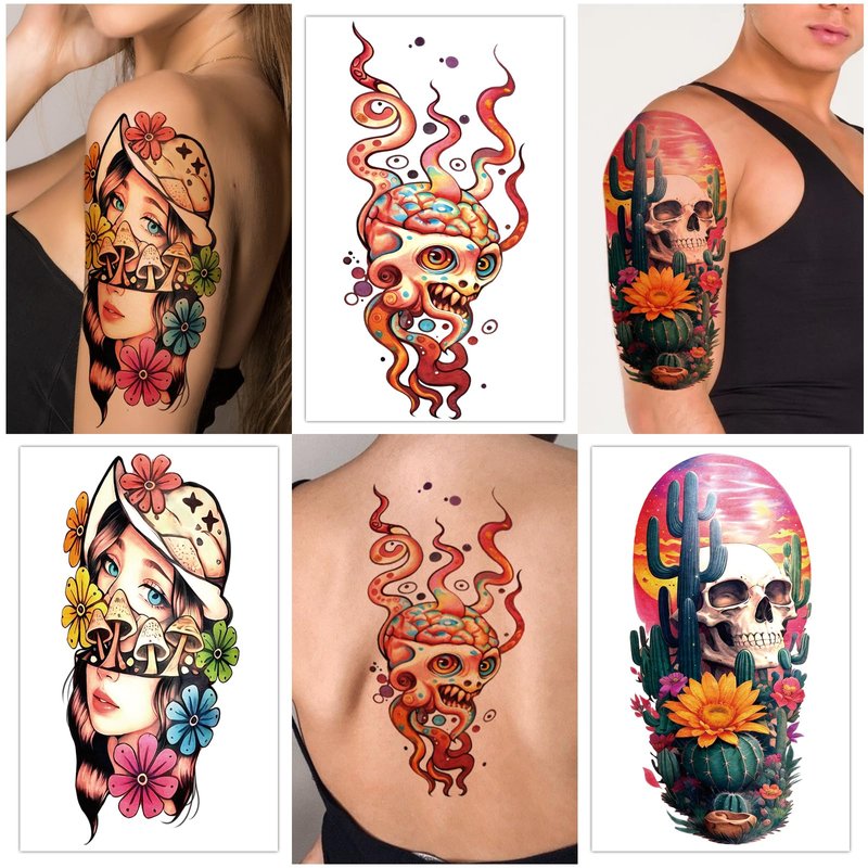 - 🍄【Large Quantity Temporary Tattoo Stickers 】These 77 sheets Temporary tattoos adult sleeve Mushroom Temporary Tattoo design 1n different sizes, including large temporary tattoos and small fake tattoos, feature with Sugar Skull Floral Tribal Eye Mushroom Cactus Butterfly UFO Space Ship Flowers Perfume tattoo stickers temporary tattoos sleeves for men and women, adult and kids.