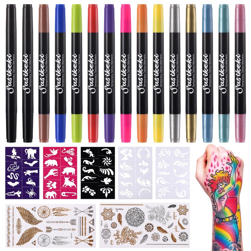 SUSIKEKI Temporary Tattoo Markers for Skin, 15PCS Double Ended Tattoo Pen + 50 Paint Stencils + 43 Tattoos Stickers, Glitter & Matte & Neon Glow Body Marker Set, Removable Fake Tattoos Kit for Teens and Adult