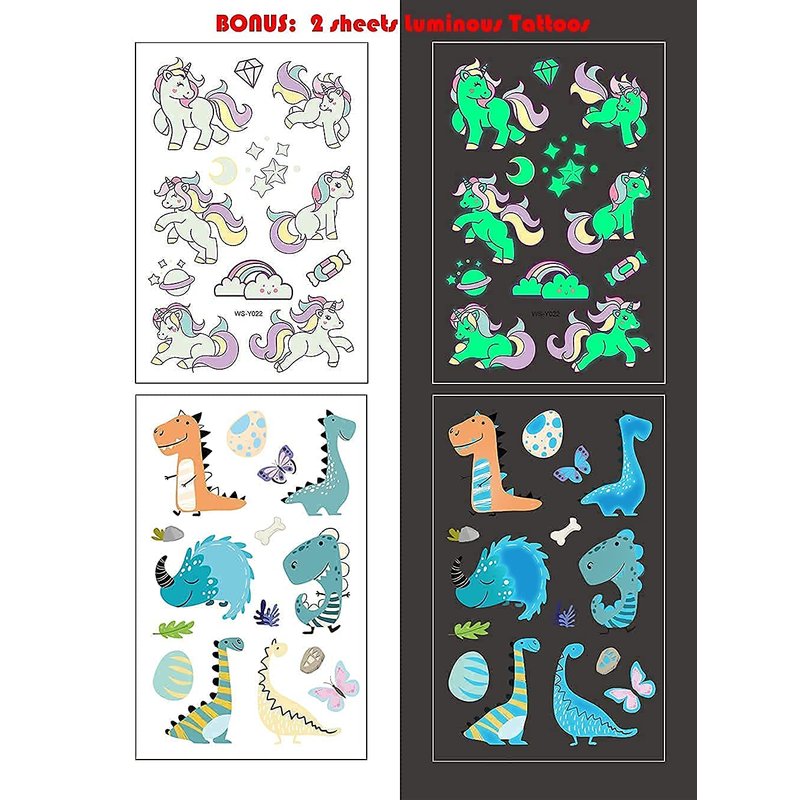 - 【Kids Temporary Tattoos】Package includes 12 sheets with a total of 150+ unique theme Glitter and Luminous Tattoos, can meet the whole kids party need, will make your child look more cute and fun.