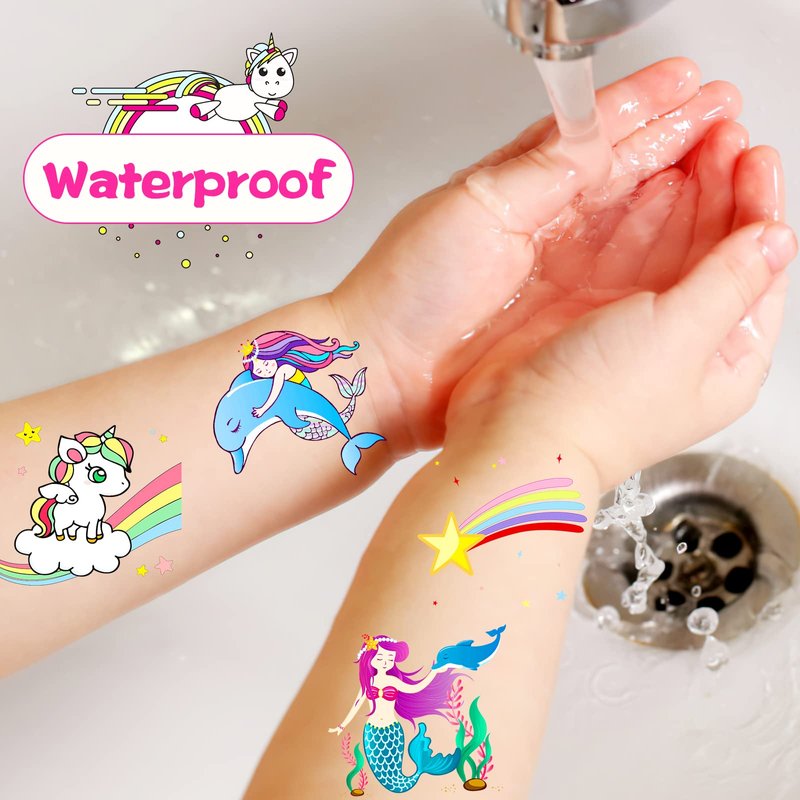 - 【Waterproof and Long lasting】Great fun unicorn tattoos party favors,uses the latest waterproof technology ,can be used in pool,shower and beach,usually last 3-5 days. Mixed theme styles with brilliant colors and super cute designs ,they're the bomb for a pool party.Children all of age loved a tattoo,even adults want it!