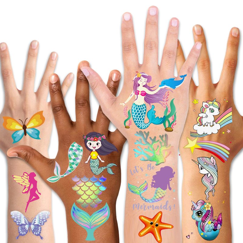 - 【Mix Style Temporary Tattoos for Kids】80pcs with 40 different pattern design temporary tattoos for Kids ,colorful and vibrant patterns for girls favor. Mix theme include mermaid,unicorn,fairy,butterfly,starfish,seaweed,shell,octopus more little girls favorite characters, a large selection and different styles of tattoos are enough for children to share with friends at the party.It’s a big hit at the party!