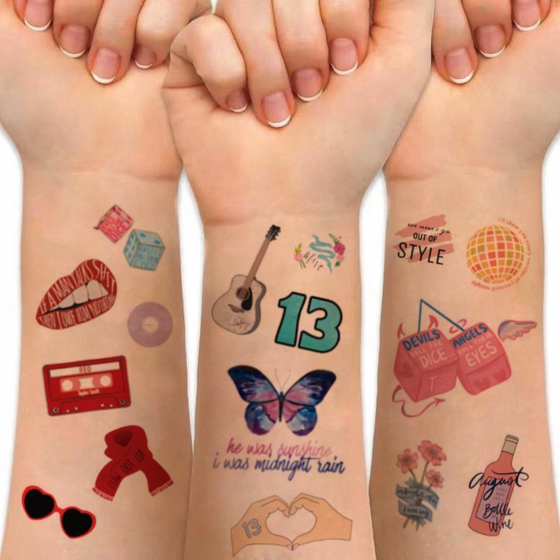 - š¤ćSafe Materialsć Our temporary tattoos are made from pure natural materials, ensuring they are safe for all skin types and environmentally friendly. The inspiration for this temporary tattoo comes from pop singer 's album. Contains 4 sheets of paper 80 pcs patterns 50 different styles. Sufficient quantity for your needs and sharing with your family or friends.