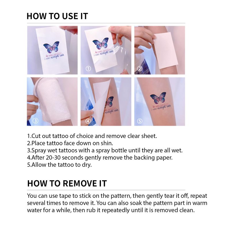 - šćEASY TO USE TATTOOć First, wipe your skin clean, cut out the pattern and peel off the protective film.Then place the temporary tattoos on your hand, arm, or wherever you want to adorn it.Wet the paper with a damp washcloth,Press the girls tattoo paper gently and slowly for 10 seconds.Finally remove the tattoo paper and enjoy concerts or parties.Simply removed with baby oil,rubbing alcohol,or hand sanitizer.Easy to use tattoos ensuring a hassle-free and quick decorating process.