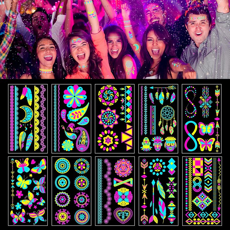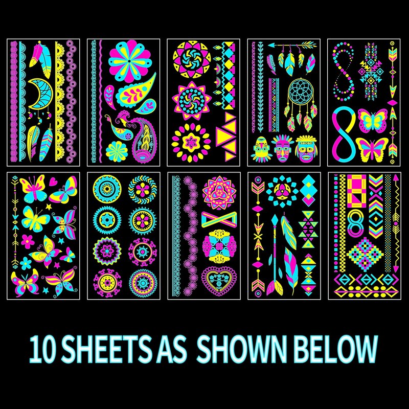 - DURABLE PARTY TEMP TATOO:Include 10 Sheets Large Neon Temporary Tattoo Stickers, Stand Out From The Crowd With a Neon Tattoo! These Vibrant Designs Use Uv-Reactive Ink To Glow Brightly Under Black Light, Making Them Perfect For Parties, Glow Rave, Glow In The Dark Party, Neon Glow In The Dark Festival, Musical Festivals, Black Light Party, Rave Night, & Club Night Outings,Edm ,Edc, Led Party,Concerts, And Other Events.