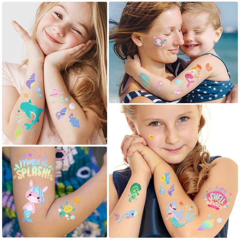 Unleash your inner mermaid with these dazzling temporary tattoos! Perfect for kids' parties, Easter baskets, or just a fun day at the beach, this set includes 4 sheets of over 80 shimmering metallic foil tattoos featuring whimsical ocean animals and mermaids. These tattoo sheets are a delightful way to let your child's imagination run wild. Apply them easily to arms, legs, or anywhere for a touch of magical flair that's sure to captivate. When the day is done, they remove effortlessly, leaving no mess behind. Dive into an ocean of fun with these eye-catching temporary tattoos that make an enchanting birthday or holiday gift for boys and girls alike!