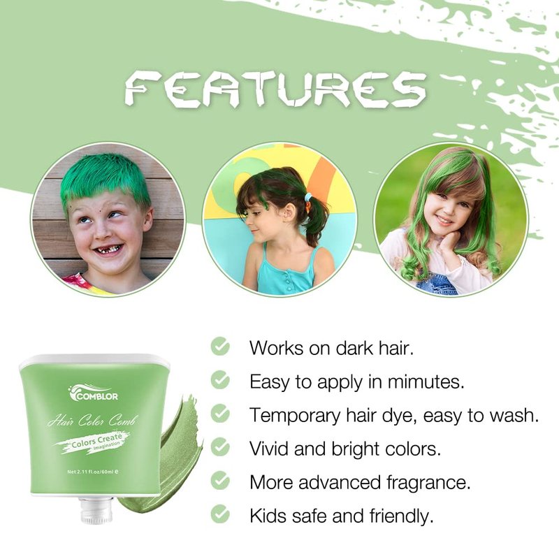 - 💗【 Ideal Toys Gifts】Comblor temporary hair color for kids is a good hair stuff for girls boys, kids, and teens aged 3 and plus who like designing their own hair, helping them express their personality and creativity. You also can use it on your lovely dog's hair. Perfect for Daily Hair Beauty, Festivals, Parties, Events, Clubbing, Raves,Easter, Halloween, Christmas, Fancy Dress, Cosplay, Children's Day, Crazy Hair Day etc.