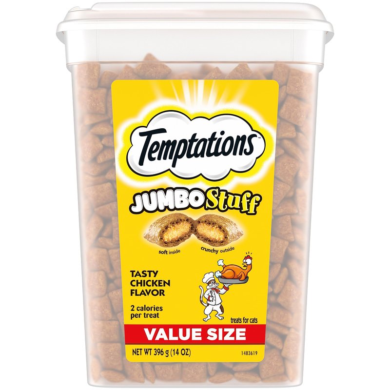 - Contains one (1) 14 oz. tub of TEMPTATIONS JUMBO Stuff Cat Treats Tasty Chicken Flavor