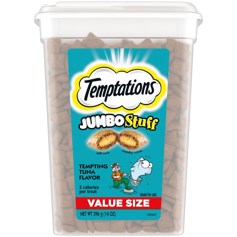 - Contains one (1) 14 oz. tub of TEMPTATIONS JUMBO Stuff Cat Treats Tempting Tuna Flavor