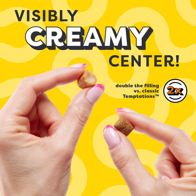- Crunchy Outside, Creamy Inside: These irresistible cat treats have a visible creamy center wrapped in a crunchy shell and have 2x more creamy filling than classic TEMPTATIONS treats